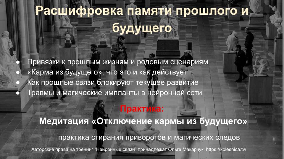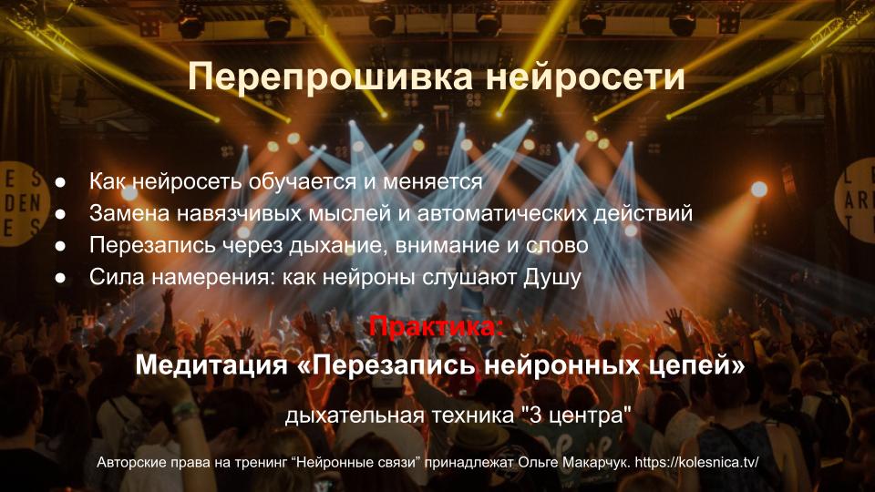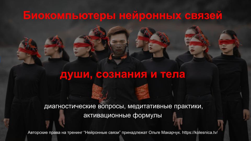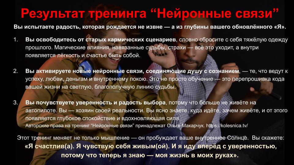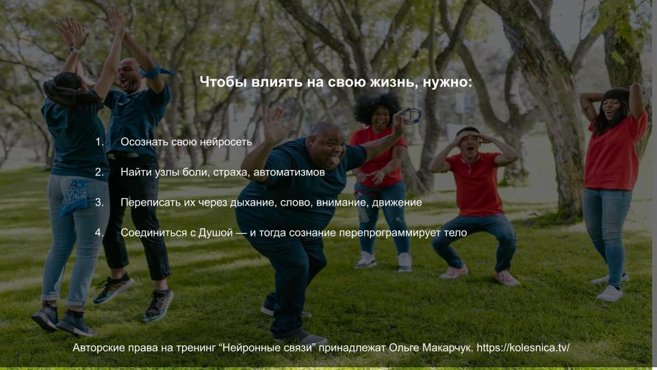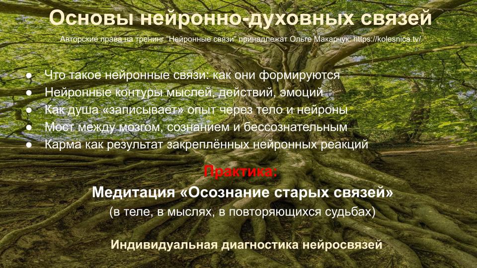 На этом тренинге мы не будем говорить в теории. Мы пойдём в глубину. Мы увидим, как твои нейронные цепи прямо сейчас определяют: — с кем ты живёшь (или не живёшь) — сколько денег ты получаешь — почему ты снова не можешь сделать шаг — и почему тело болеет, когда душа молчит