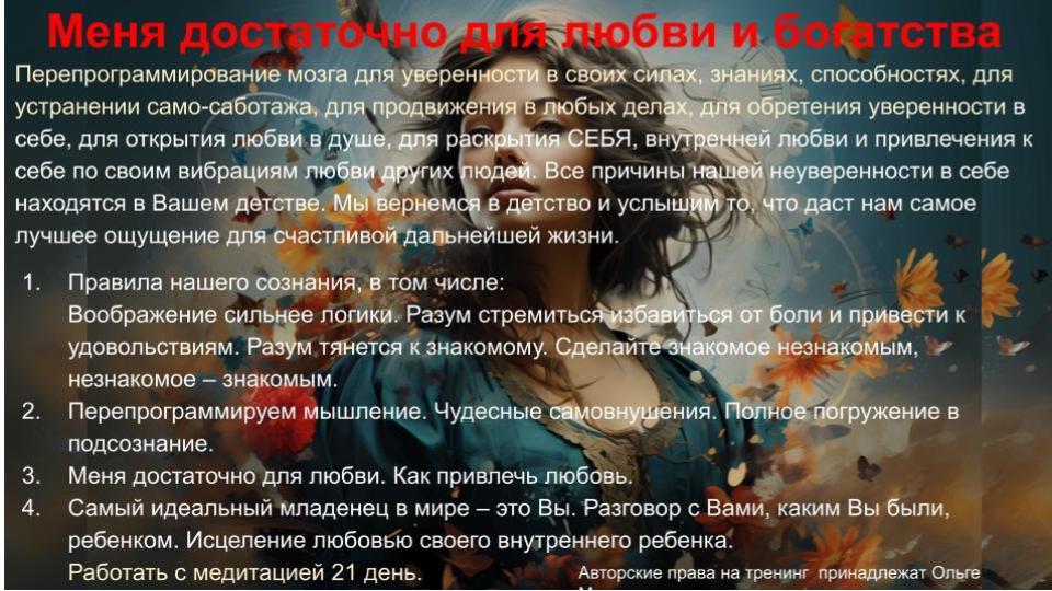 - Мягкий гипнотический голос помогает мозгу отпустить старые установки.