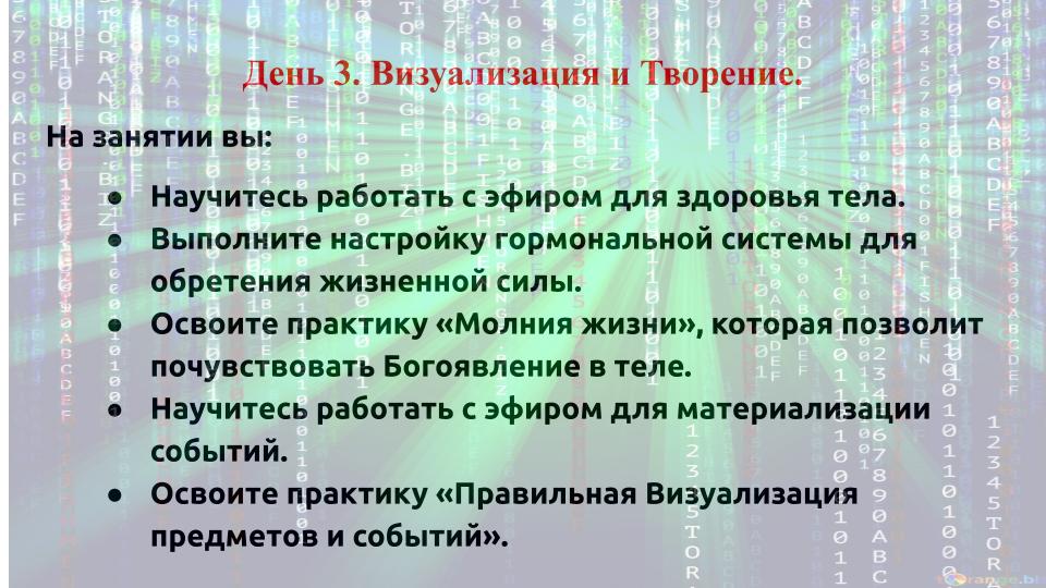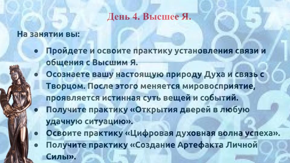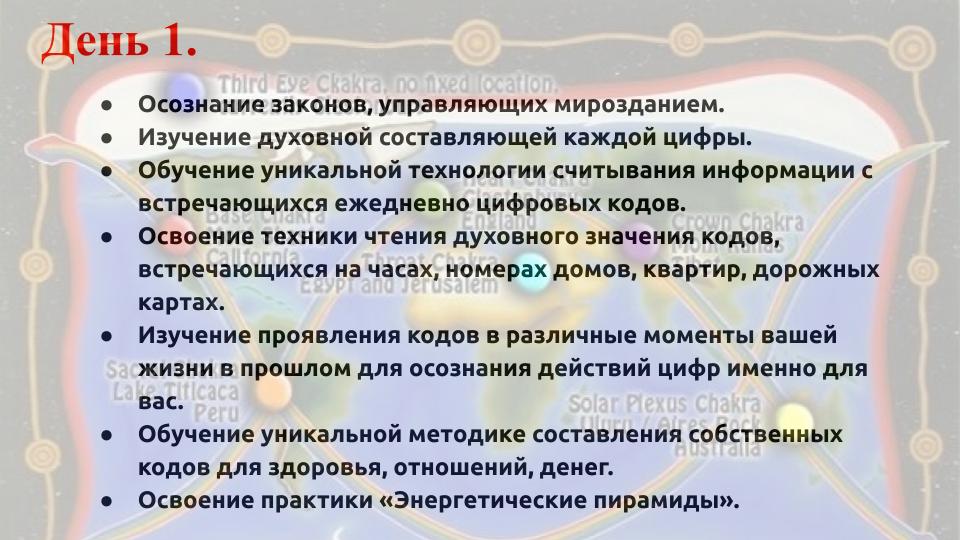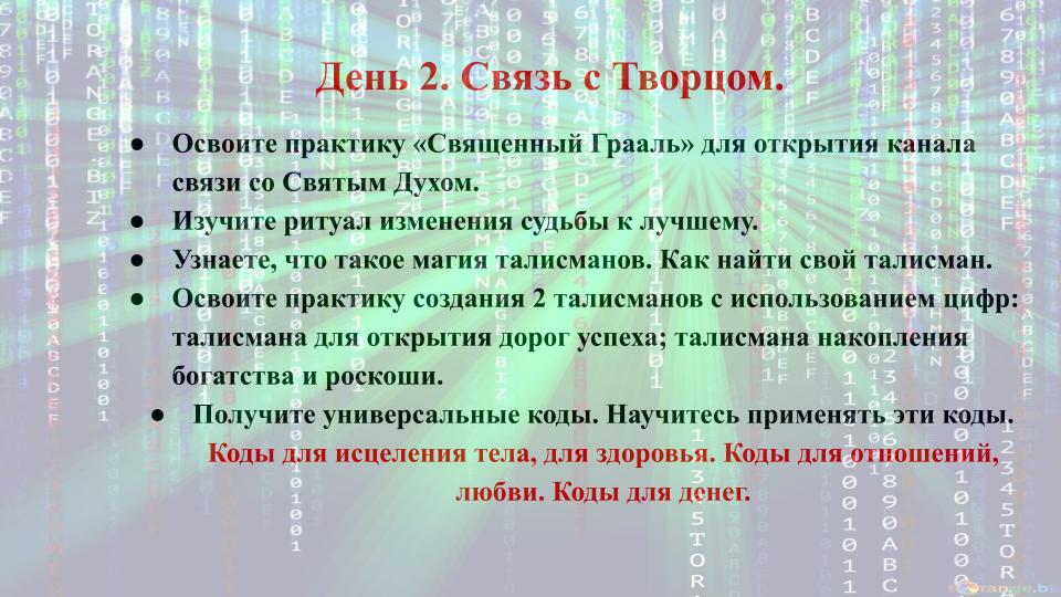 1. Вы освоите уникальные методики определения цифровых кодов, которые управляют человеком, создания кодов под любые запросы: