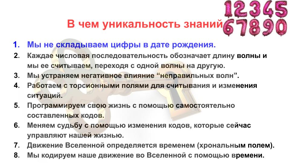 2. Эксклюзивные знания. Вы поймете, что классическая нумерология вводит в заблуждение. Вся Вселенная строится по цифровым кодам. Запускаются дни, часы, минуты для разных событий; создаются энергетические каналы для определенных энергий, чтобы на Земле случились события хорошие (или разрушающие старое).