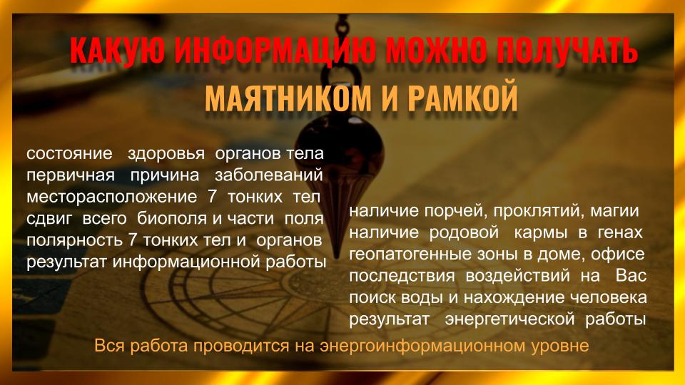 Навыки биолокации проявляются сразу на тренинге и остаются с Вами всю жизнь. Не получиться тестировать рамочкой или маятником не может, получается абсолютно у всех, так как Вы получите авторскую методику тестирования торсионных полей от ее разработчика Ольги Макарчук. Знания о восстановлении правильной полярности останутся с Вами навсегда и Вы сможете научить этому своих детей и внуков, чтобы они тоже стали здоровыми и счастливыми.