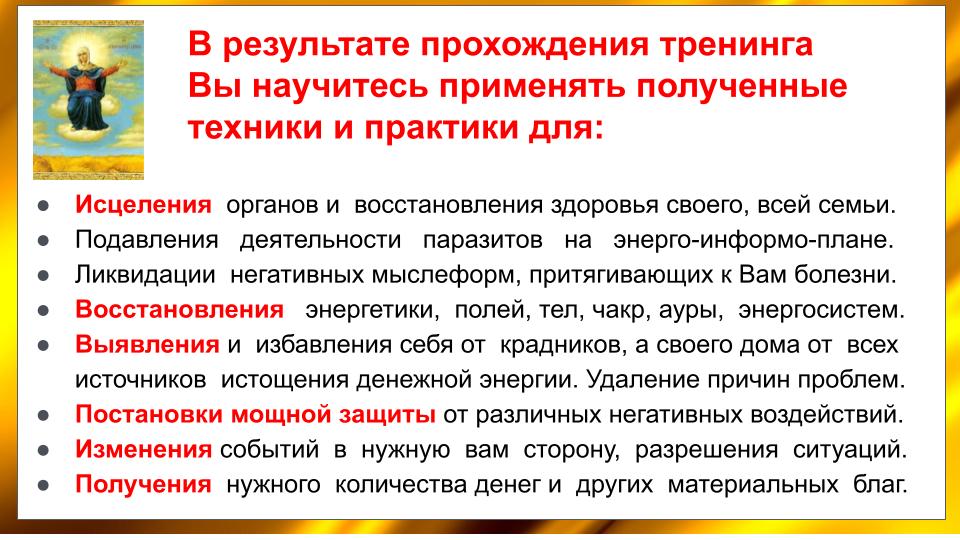 Все практики экологически чистые, основаны на знании физики торсионных полей, 100% безопасность применения практик без магии. Работа в энергиях Творца и Святого Духа, знание биолокации Вы получите на тренинге.