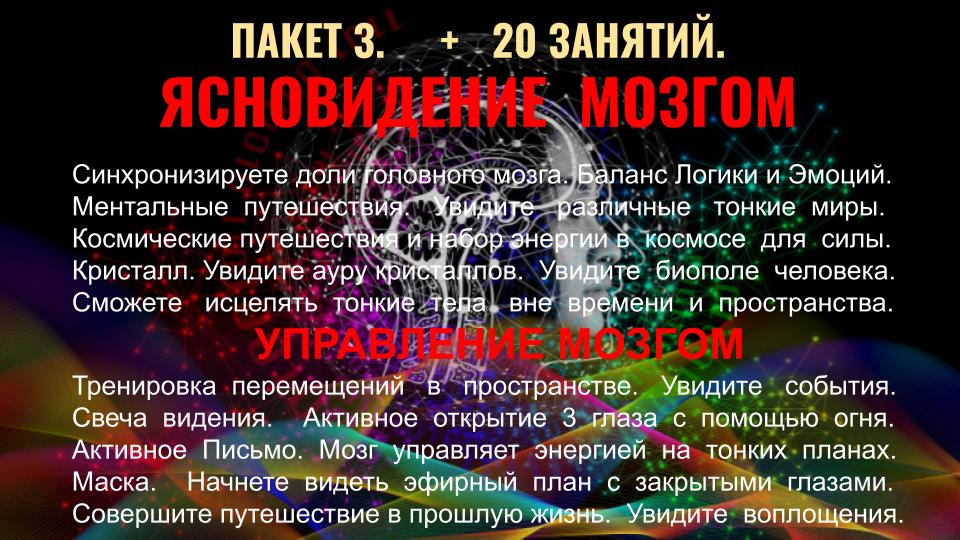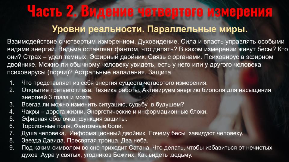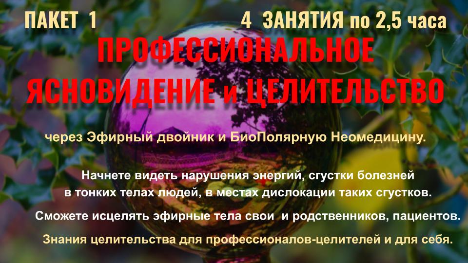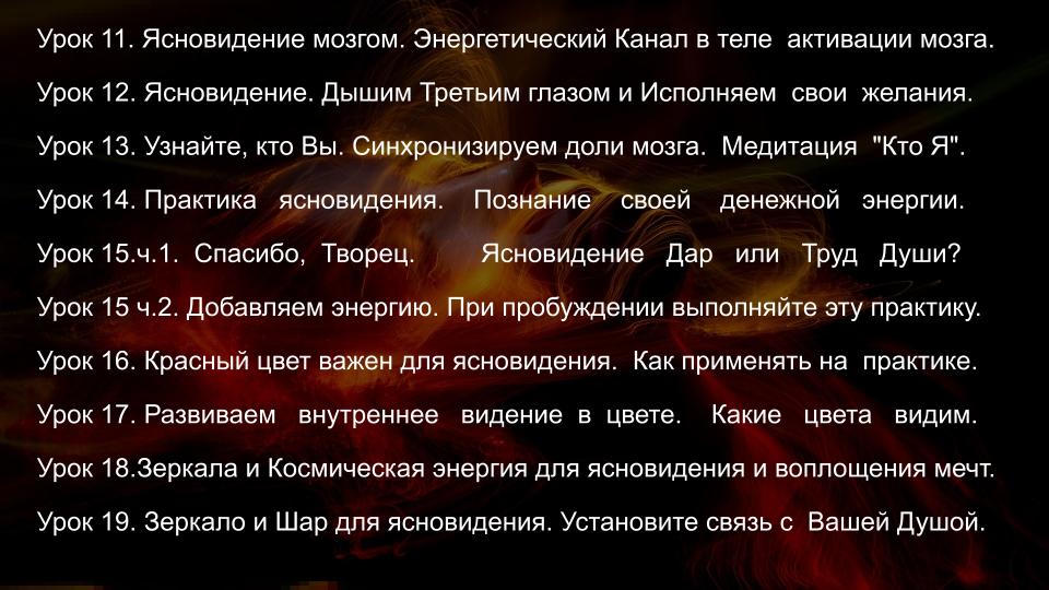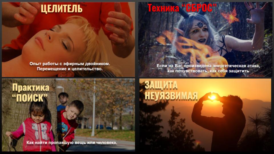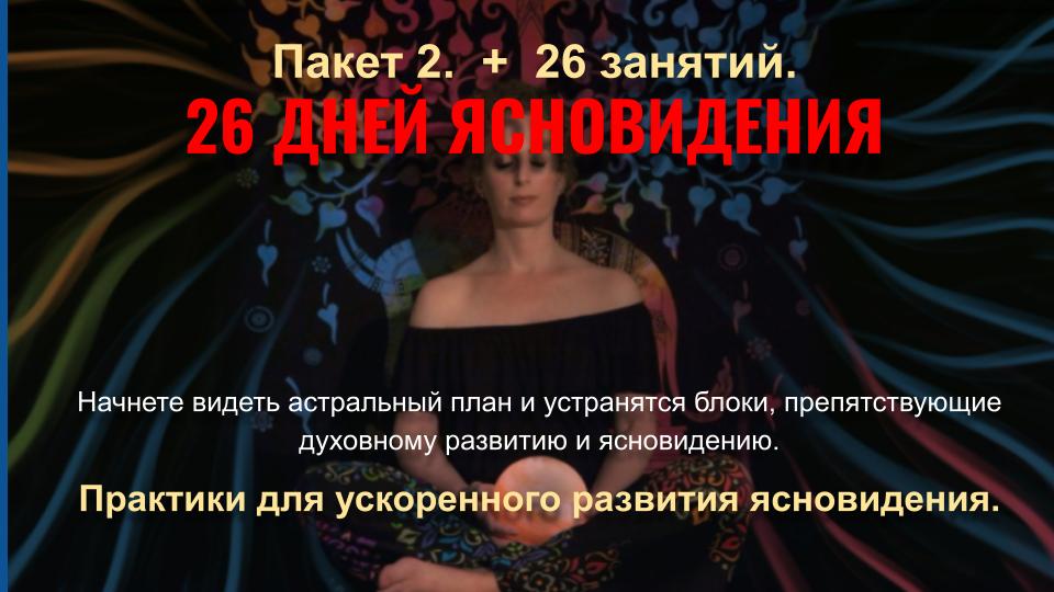 - Ясновидение и Яснознание - открытие третьего глаза, управление вещими снами, получение информации прошлого, будущего и скрытого настоящего, дальновидение, сканирование внутренних органов, использование ясновидения в целительстве, трансовые медитации, пространственная работа, перемещения и путешествия на тонком плане.