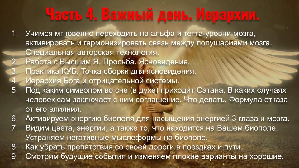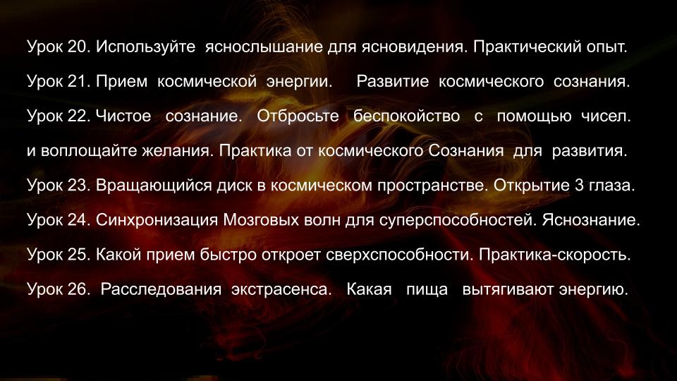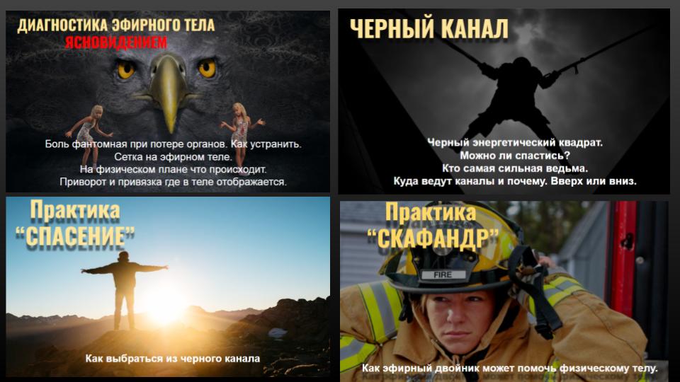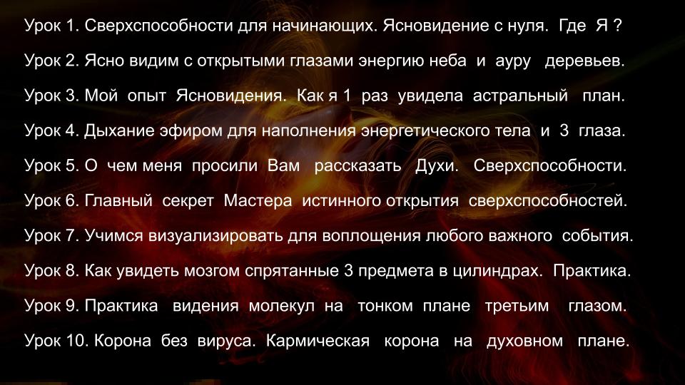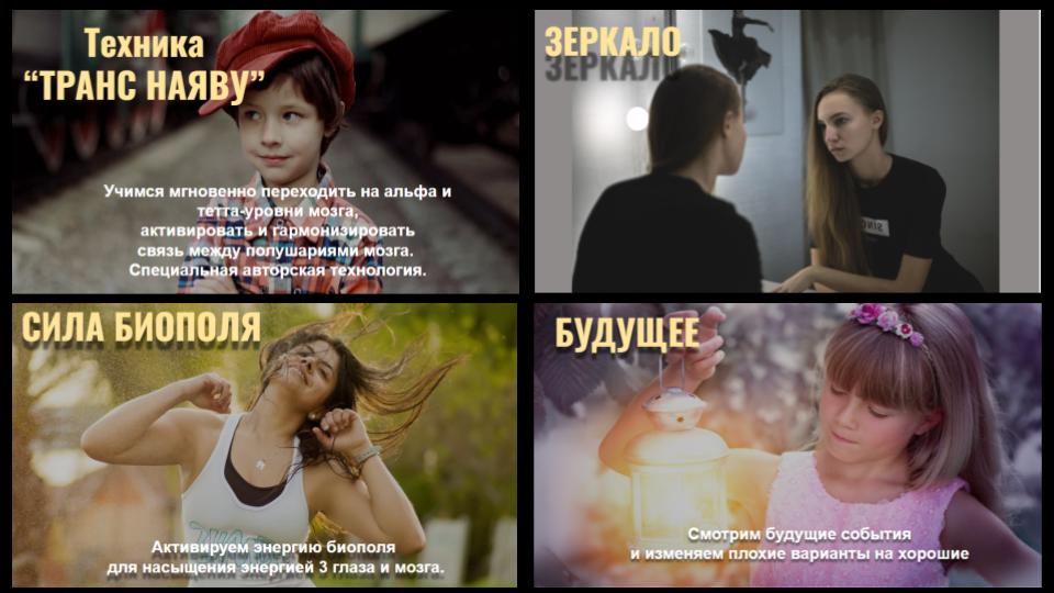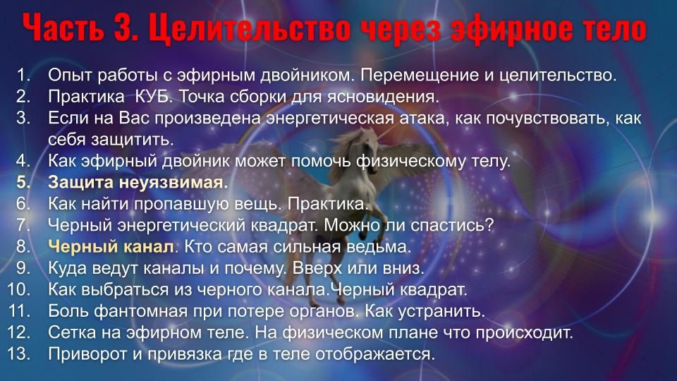 - Ясновидение и Яснознание - открытие третьего глаза, управление вещими снами, получение информации прошлого, будущего и скрытого настоящего, дальновидение, сканирование внутренних органов, использование ясновидения в целительстве, трансовые медитации, пространственная работа, перемещения и путешествия на тонком плане.