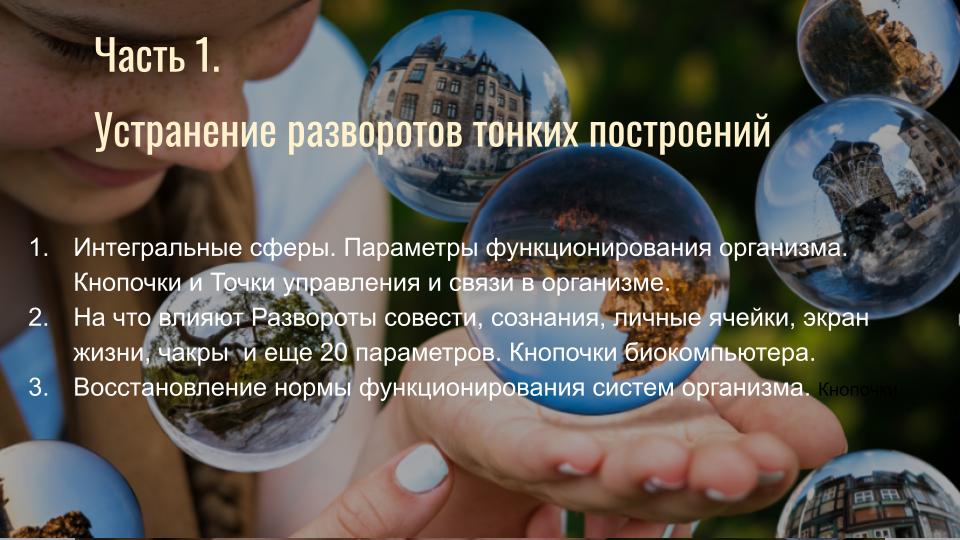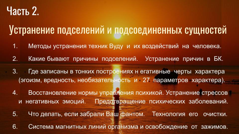 На тренинге мы на энерго-информационном плане удалим причины нарушений биополя органов и всего тела (негативное воздействие окружающей среды, в том числе человека) , а также восстановим нормальное месторасположение всех чакр и тонких построений.