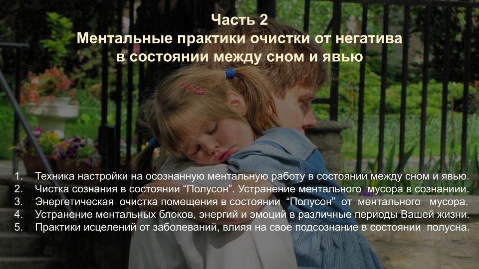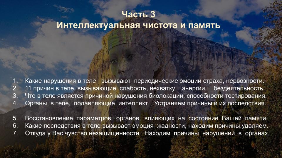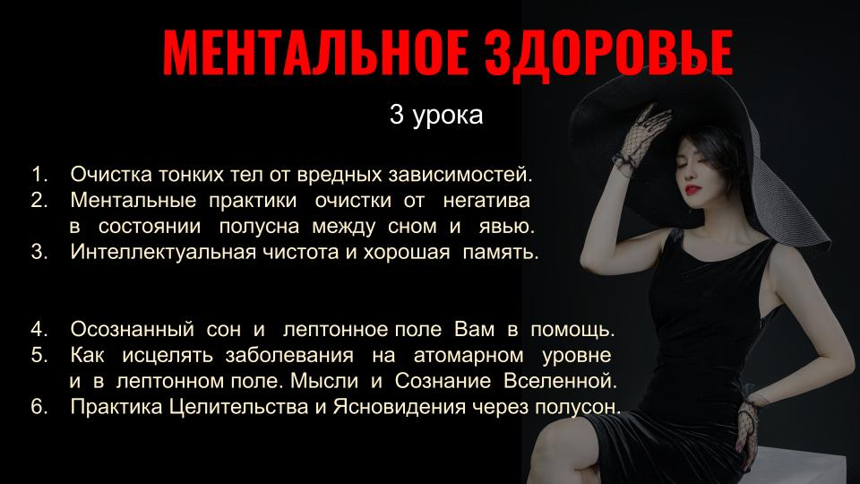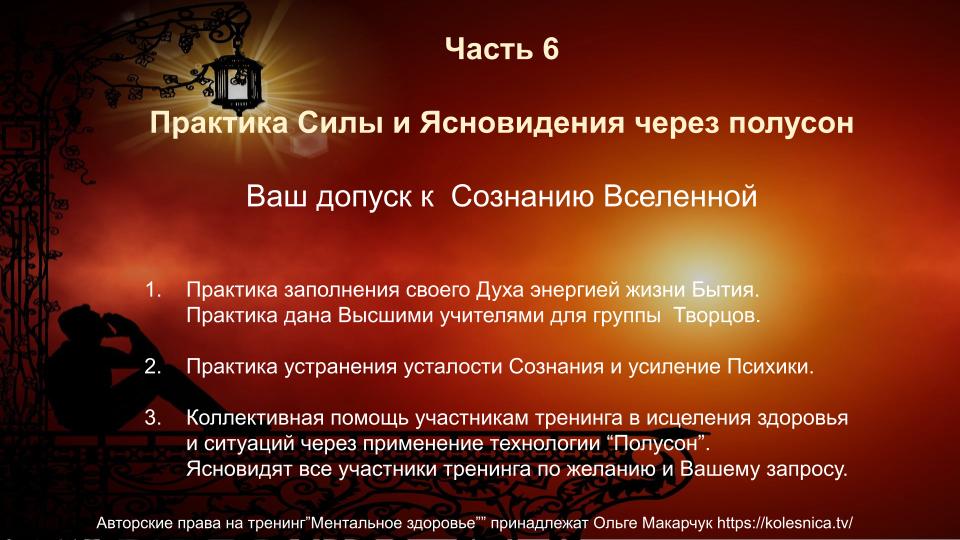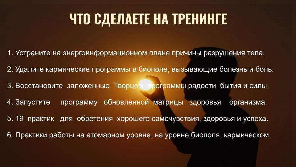 Теперь Ваша очередь облегчить себе жизнь и исцелиться, стать более успешным, применяя эту же методику, которую Вы получите на тренинге «Ментальное здоровье». Практики, которые Вы освоите на тренинге, станут Вашим допуском к Сознанию Вселенной.